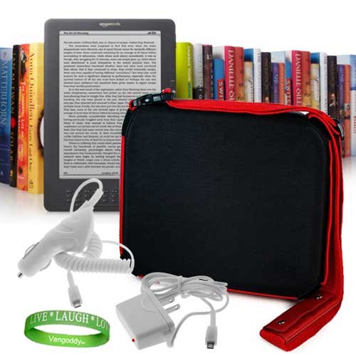 Amazon Kindle DX Free 3G model ( Graphite , White , Latest Generation , 2nd Generation ) Accessories Kit: **Graphite ? Red** Kindle DX Carrying Case Hard Cube Case with Shoulder Strap and Attached Pocket + Kindle DX Car Charger + Kindle DX Wall Charger + VG Live * Laugh * Love Wrist band!!! Overview